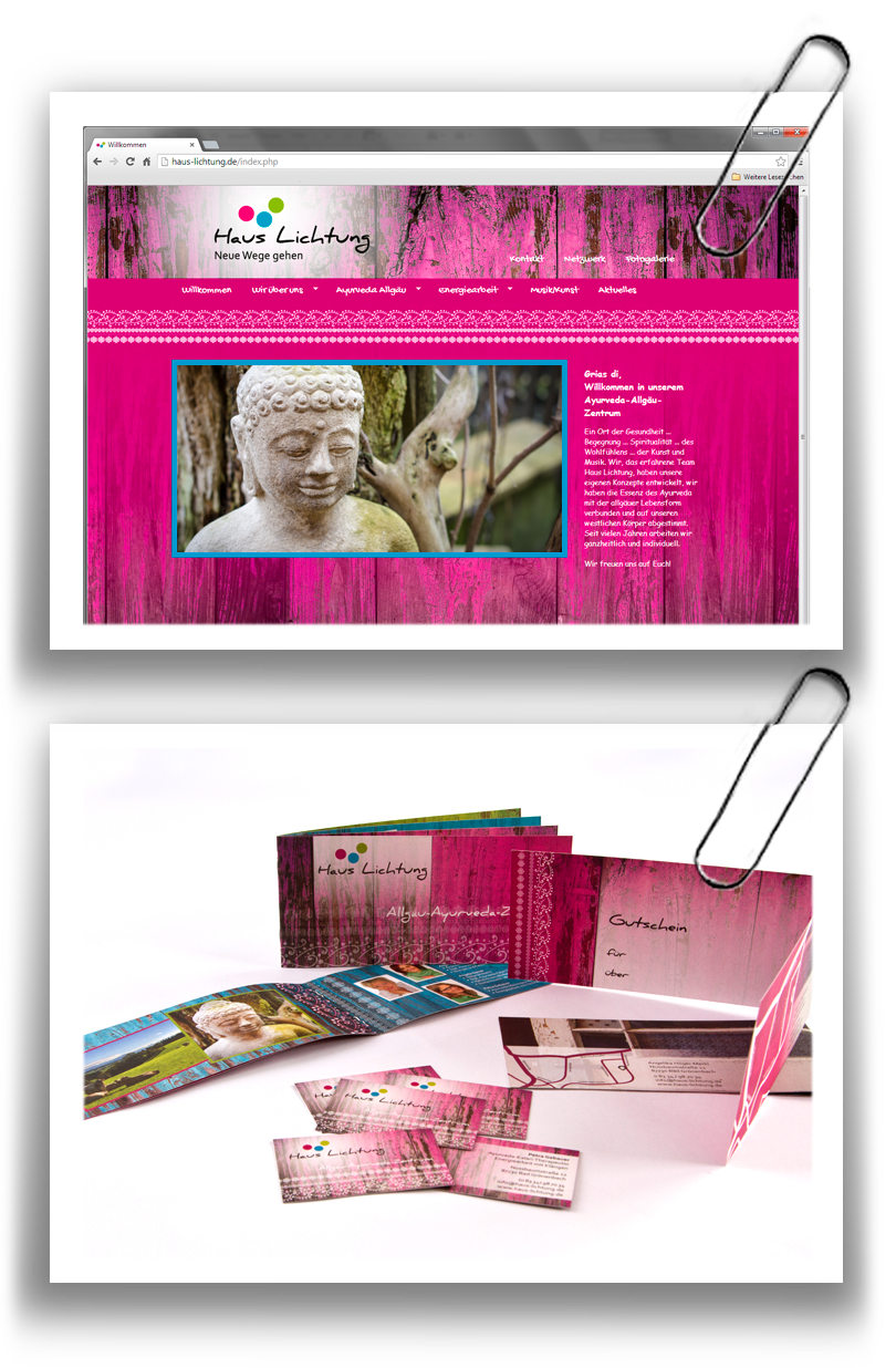 Als wir uns über die Weiterentwicklung des Corporate Design, das Logo Design, der Website, Gutscheine und der Fassaden-Banner unterhalten haben, wurde sehr schnell klar, dass wir in unserer Gestaltung eine Kombination aus "Allgäu" und "Indien" finden müssen. Denn die Ayurveda-Allgäu-Kraftkur ist ein wichtiger Bestandteil des Leistungsangebots von Haus Lichtung.